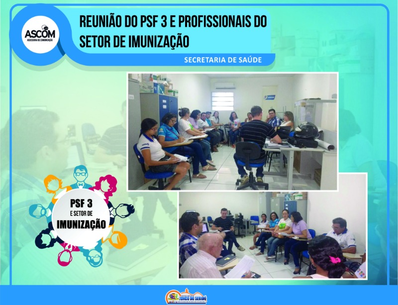 Reunião na sede da Secretaria de Saúde, com os Profissionais do PSF 3, Profissionais do Setor de Imunização e o Coordenador de Atenção Básica Fernando Régis. Pautas abordadas, Atualização e informes sobre imunização; Processo de trabalho organizacional Semestral (Ponto eletrônico, Cronograma de atendimento); Cadernos de Avaliação do AMAQ/PMAQ e alguns informes internos.