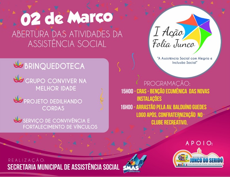 A Prefeitura Municipal, através da Secretaria de Assistência Social, convida todos os inscritos nos serviços e grupos, para no dia 02 de março de 2017, participarem da abertura de suas atividades, com a seguinte programação: