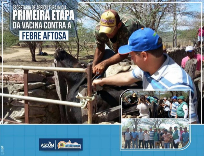 A Prefeitura Municipal de Junco do Seridó, através da Secretaria Municipal de Agricultura, deu início nesta terça-feira (23) a primeira etapa de vacinação contra a FEBRE AFTOSA. A vacina orientada foi na comunidade Ipoeiras, na propriedade do Sr. Samuel Nóbrega, e contou também, com a participação e ajuda da Defesa Agropecuária e Emater. Foram vacinados 61 bovinos de quatro criadores.