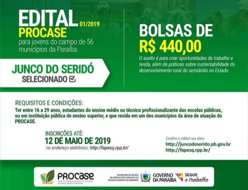 O Projeto Desenvolvimento Sustentável do Cariri, Seridó e Curimataú (Procase) lançou edital com bolsas de R$ 440 para jovens do campo. As bolsas com duração de seis meses são destinadas a estudantes com idade entre 16 a 29 anos.