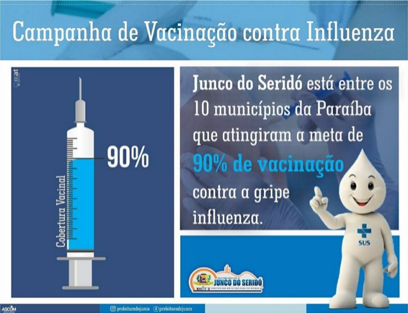 Junco do Seridó está entre as 10 cidades da Paraíba que atingiram a meta de 90% de vacinação contra a influenza (gripe), percentual estabelecido pelo Ministério da Saúde, e entre as cidades atendidas pela 6° Regional de Saúde, o nosso município ficou em 7° lugar.