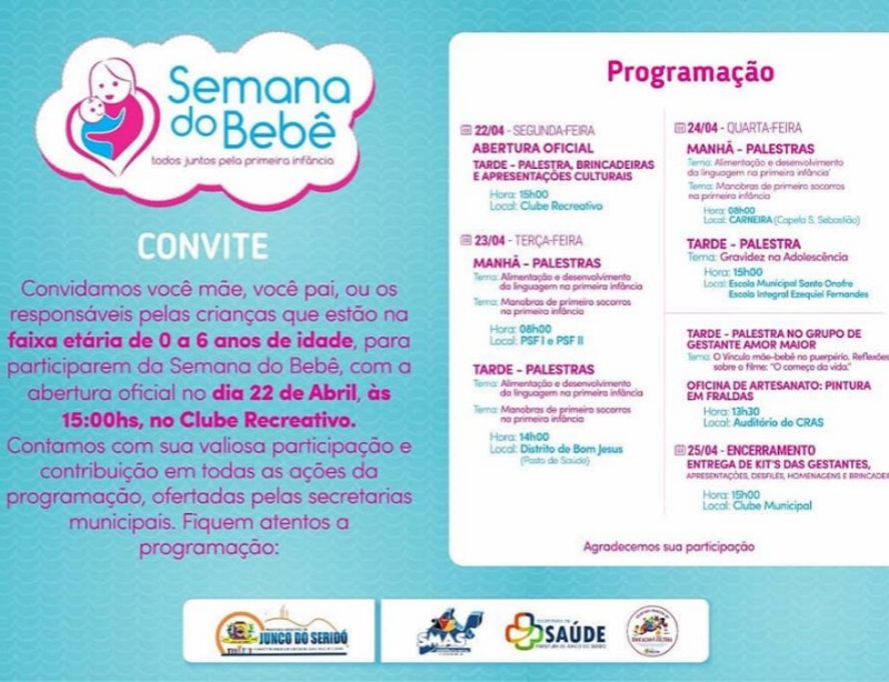 Vai começar uma semana toda especial. Vem aí, a SEMANA DO BEBÊ, de 22 a 25 de abril, com o tema: "Zelar pela primeira infância. Uma responsabilidade de todos". Venha fazer parte da programação, onde irão acontecer palestras, oficinas, apresentações culturais, brincadeiras e grupo de gestante Amor Maior com a entrega de Kits maternidade. Venha fazer parte desse momento todo especial em nosso município.