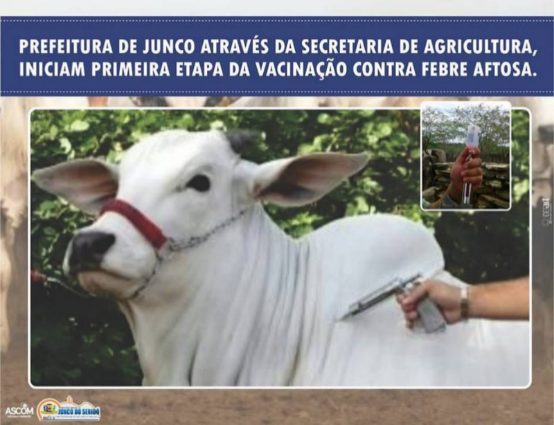 A Prefeitura Municipal de Junco do Seridó, através da Secretaria Municipal de Agricultura e o apoio da Emater, estão iniciando a primeira etapa da campanha da febre aftosa do ano 2017. O prefeito Kleber Medeiros, confirmou a doação de vacinas para todos os criadores do município. O controle das doações será de responsabilidade da Secretaria Municipal de Agricultura, Emater e da Unidade de Atendimento da Defesa Agropecuária.
