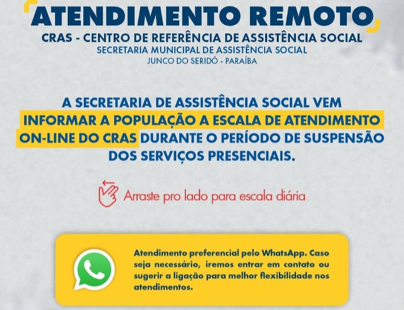 Devido o agravamento da crise sanitária causada pela Covid-19, a Secretaria de Assistência Social do Junco do Serídó adotou o sistema de atendimento online à população. A medida tem o objetivo de assegurar o funcionamento de atividades, independente do período de restrição de ações presenciais.