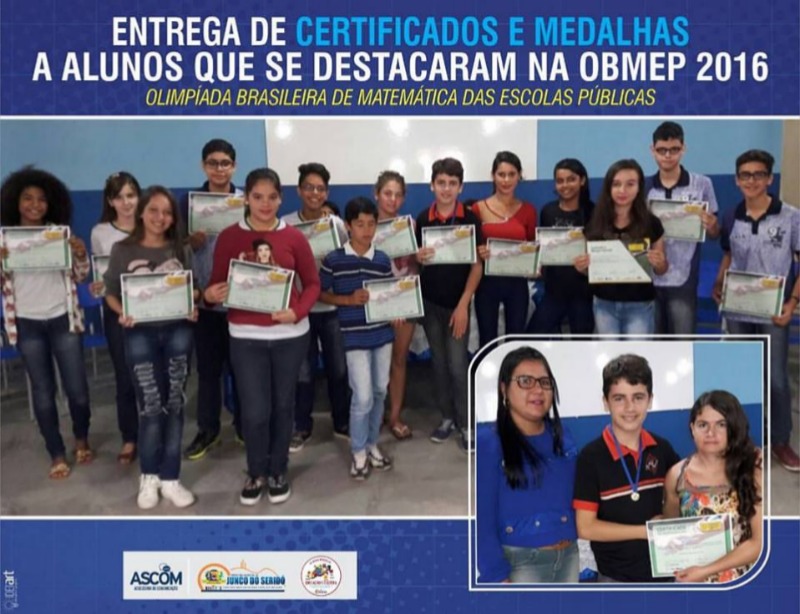 Foi um momento de muita alegria para toda a comunidade escolar, onde foi celebrada a conquista dos 16 alunos do 6° ao 9° ano que obtiveram sucesso na OBMEP 2016, dentre os quais se destacou a aluna Gislayne Medeiros que conquistou Certificado de Menção Honrosa e o aluno Michel Diniz que conquistou Medalha de ouro, ficando entre os 6 Medalhistas de ouro do Estado da Paraíba.