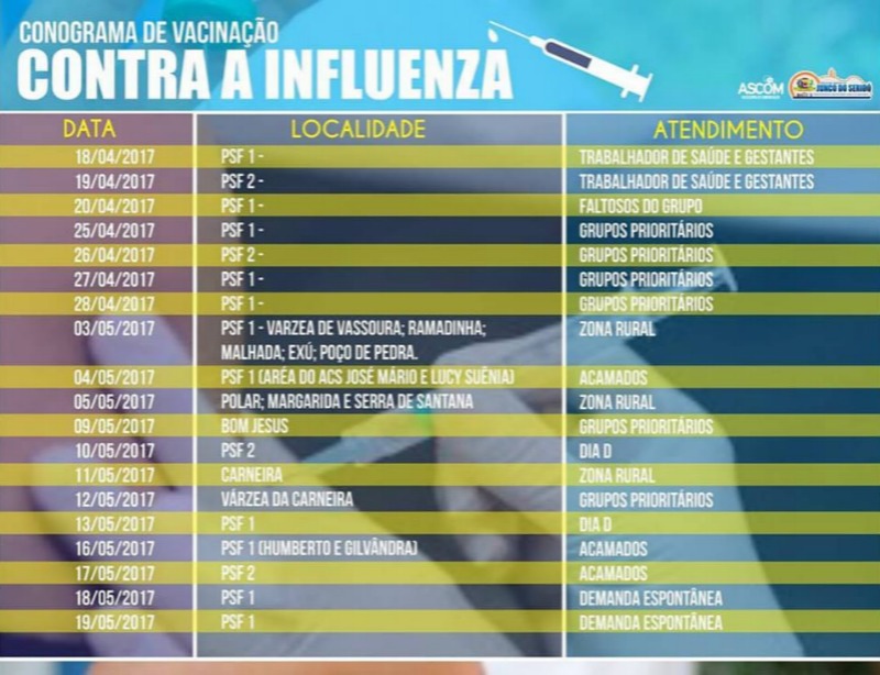 A secretaria municipal de saúde divulgou o cronograma de vacinação contra a gripe, que vai até o dia 19 de Maio e o público alvo é crianças apartir de 6 meses e menores de 5 anos, gestantes, puérperas, idosos apartir de 60 anos, portadores de doenças crônicas, profissionais da saúde e professores. O ponto alto da campanha acontece nos dias 10 e 13 com o dia "D", nas unidades de saúde - PSF 1 e 2. A meta é vacinar 90% da população, estabelecida pelo Ministério da Saúde.